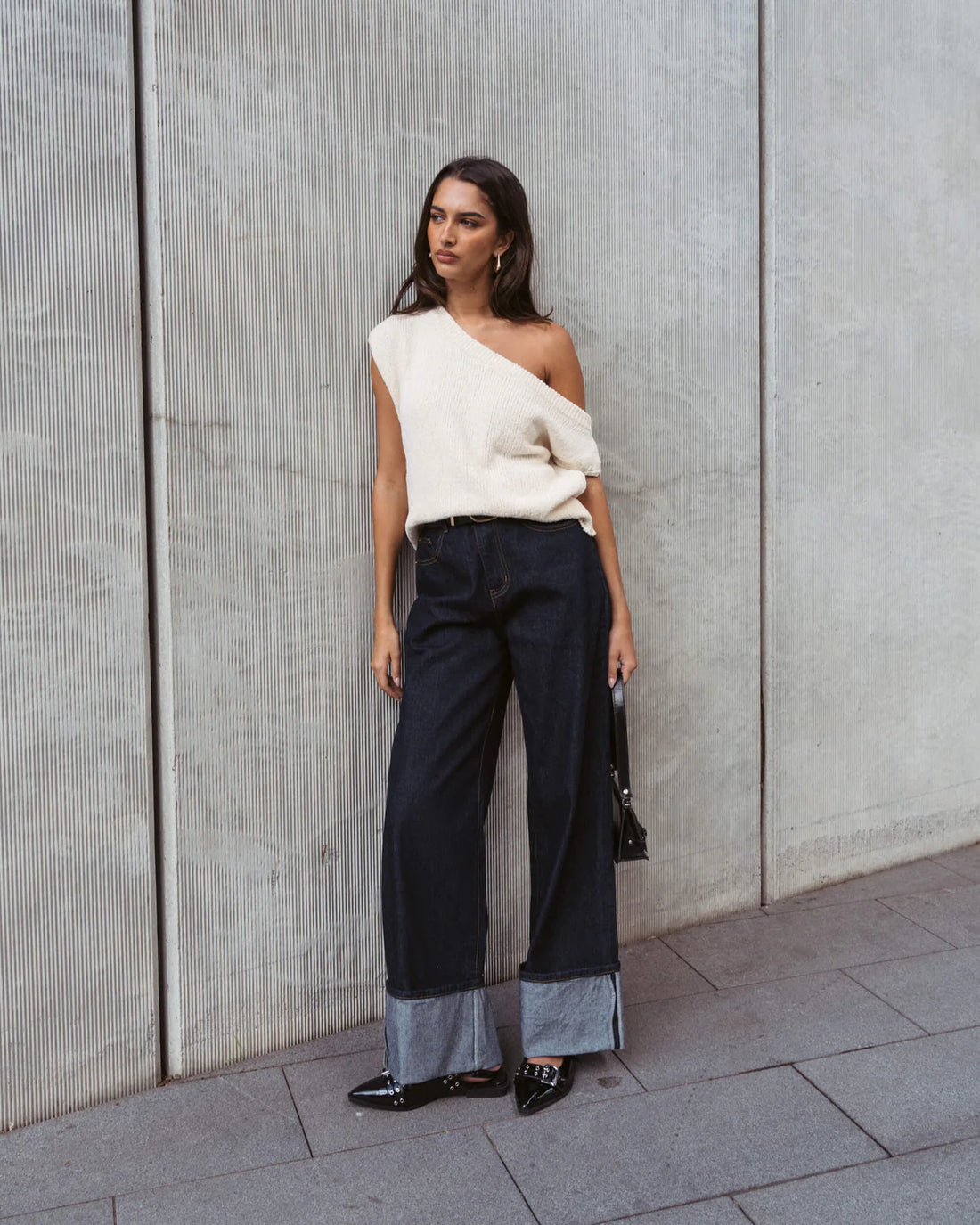 Off the shoulder soft asymmetrical knit top. Regular length, relaxed fit. An essential item that...