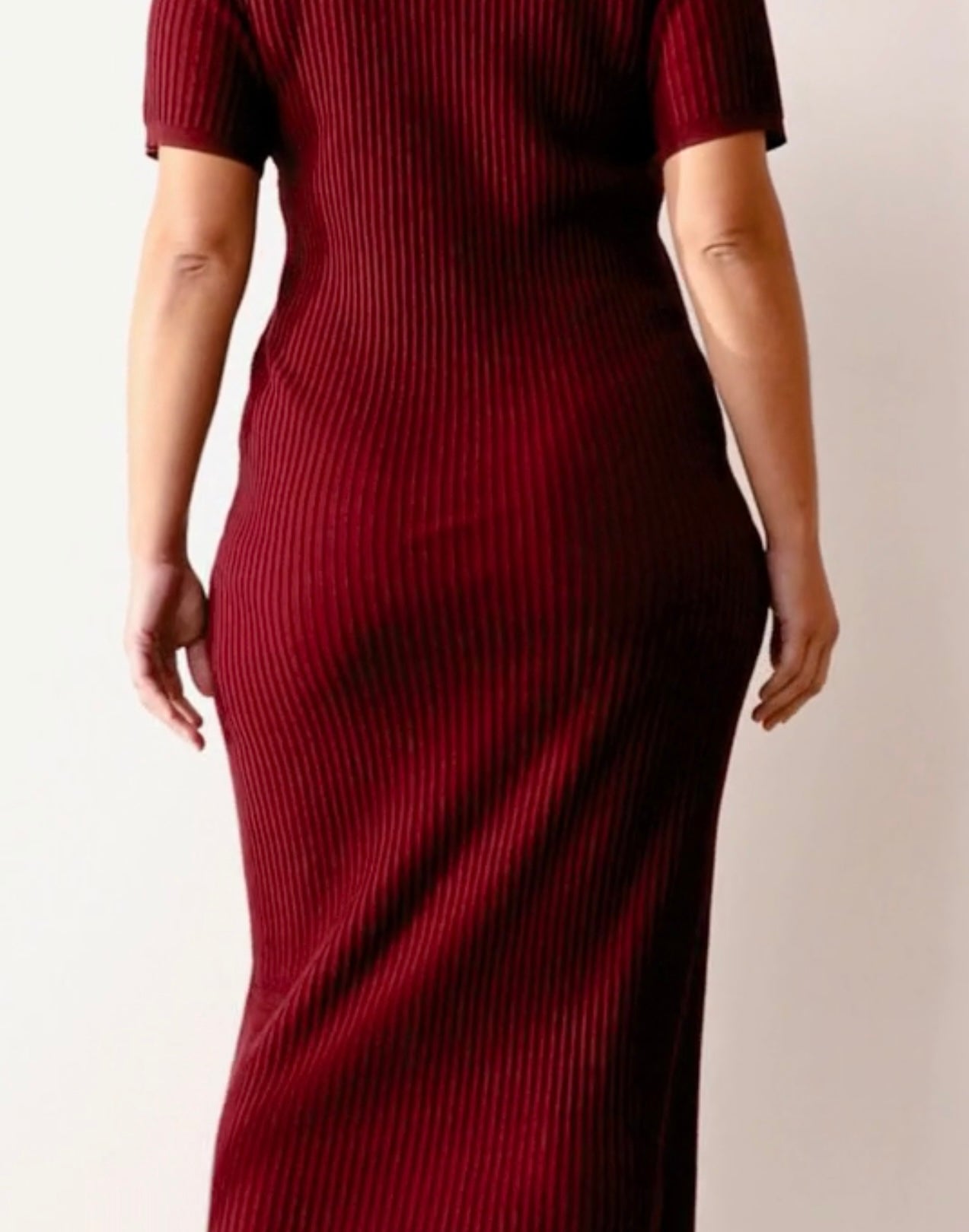 Comes in the colour of the season "burgundy/wine" in a stretch, knit material.