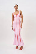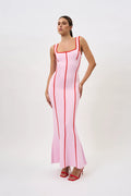 The Belle Contrast Pipe Knit Dress is designed to be eternally elegant with its form fit and soft square neckline. Made from a firm mid weight fabrication the dress flares out at the bottom for dramatic effect. Featuring contrast red piping around the neckline, armholes & down the front body.