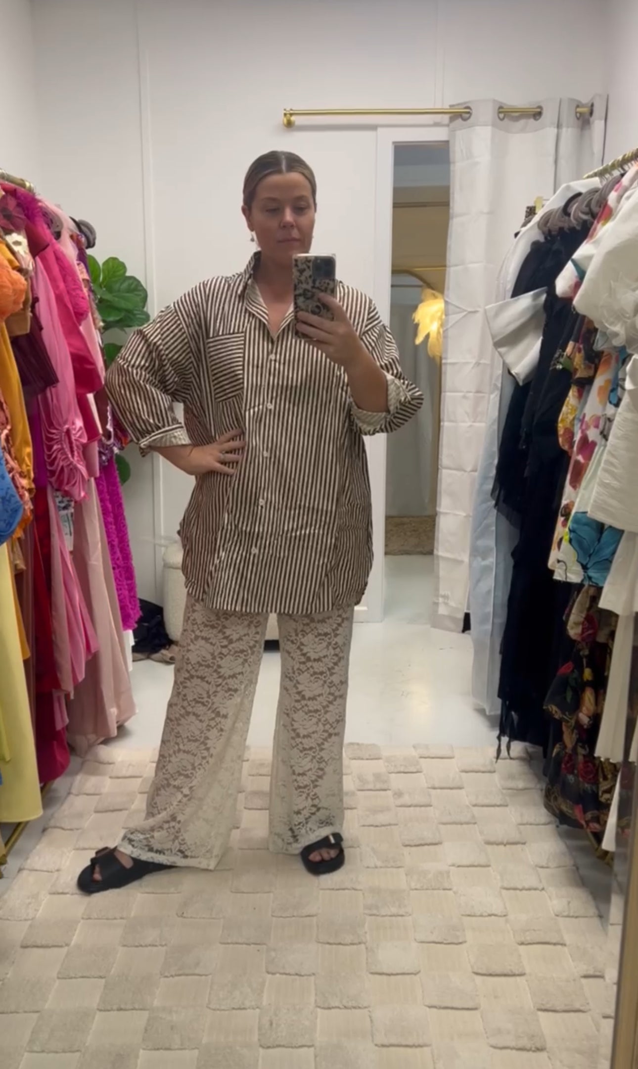 This By Frankie set combines a striped blouse with delicate lace pants, offering versatile styling options. Wear the blouse with jeans for a relaxed yet polished look, or pair the lace pants with an oversized tee for effortless casual chic. Together, they create a refined and dressy ensemble suitable for various occasions. Available in multiple sizes, this set adapts seamlessly to your wardrobe needs.
