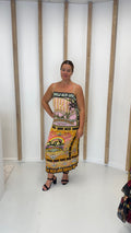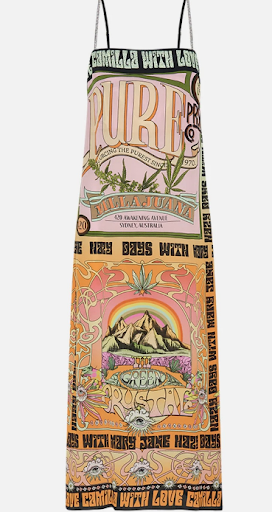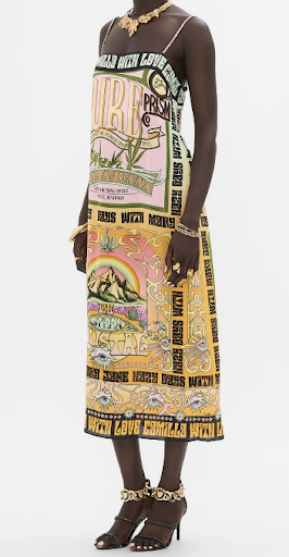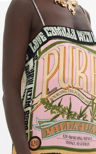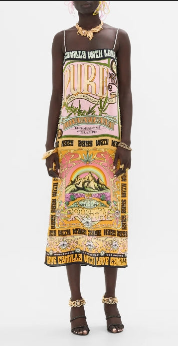 The Lets Chase Rainbows Square Neck Midi Dress depicts psychedelic postcards of cannabis and vintage poster art. Immerse yourself in the sumptuous elegance of this luxury silk dress. This exquisite midi dress showcases a streamlined silhouette. The dress features a centre back invisible zip enclosure, ensuring a seamless and polished look paired with the chic square neckline framing the décolletage with timeless charm. The delicate adjustable shoulder straps add a touch of femininity as hand-embellished crystals adorn this slip dress. RRP $799