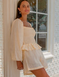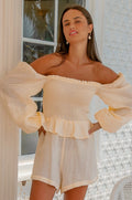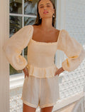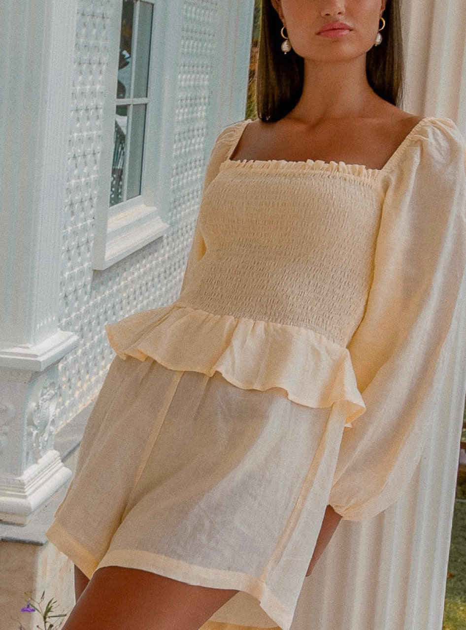 The Montana yellow linen romper playsuit in a butter colour is made from a crisp sustainable linen. Featuring long balloon sleeves, a shirred elastic bodice, and waist flounce. The elastic waistband means that it fits a variety of different bust sizes. Perfect for relaxed coffee date with girlfriends, or on vacay. Exclusively by Palm Collective. Features:
