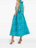 The Serafina Halter Midi Dress is an eye-catching piece, tailored from premium printed slub taffeta in hues of blue and green. It features a feminine halter neckline and fitted bodice, adorned with front cut outs and gold detailing. Cinched at the waist, the circular skirt shapes a flattering silhouette, complete with a zip fastening at the back for a precise fit. Adding a charming and polished touch, a beautiful bow and buttons at the back of the neck secure the dress. Fully lined.