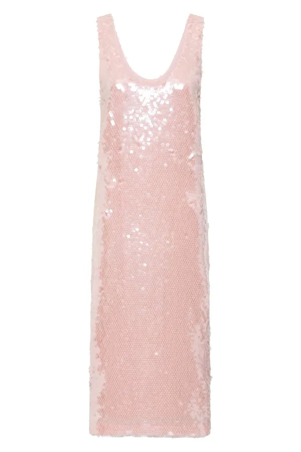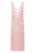 Glittering through a delicate shade of the palest pink, this sleeveless dress delivers statement styling as it pairs dazzling sequinning with an effortlessly wearable design. Falling to a flattering midi length to reveal loose, relaxed shaping, the fully lined dress continues to appeal with low U-shaping at the neckline front and back, complemented by similarly scooped armholes.