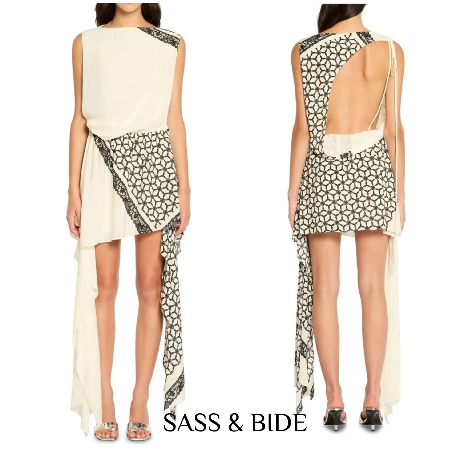 Styled to create a statement, this ivory mini dress effortlessly pairs dramatic asymmetric design with delicate lace motif print artwork, while keeping things flowy and fluid with waterfall drape panels at each side of the leg. Defined through the waist, the dress reveals a feature cutout through the low scooped back, while tying neatly at one shoulder to complete the look. Features: Asymmetric design, Lace motif print artwork, Waterfall drape panels, Low scooped back. The Tables Manner Mini Dress is made from 100% Viscose.