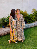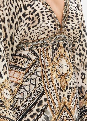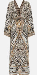 The Mosaic Muse Gathered Kimono Dress echoes a world of flowing arches and elaborate mosaic arrangements. Be captivated by the exquisite beauty of our luxury silk dress, adorned with signature CAMILLA crystals. Embracing a relaxed maxi silhouette, this dress gracefully dances at the ankle, exuding elegance with every step. The deep V neckline adds a touch of sophisticated allure. The cinched waist, with a shirred panel at the back, accentuates the perfect fit. The dress is elevated further with a statement kimono sleeve, adding a sense of visual drama. RRP - $899