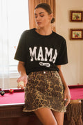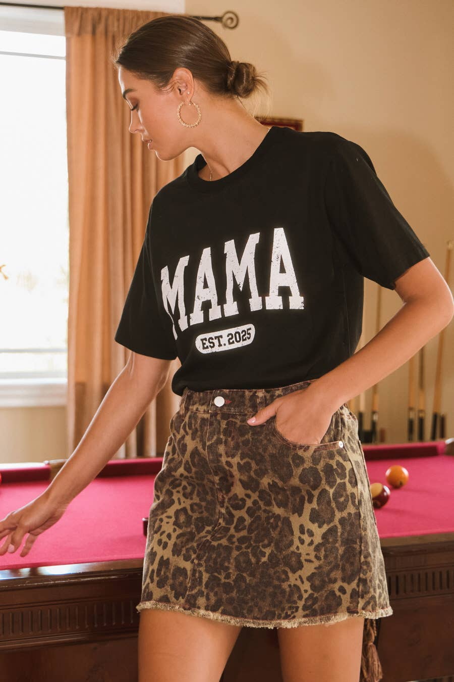 Washed leopard printed denim mini skirt with frayed hem and contrast stitching detail. Pair with an oversized tee to be comfortable and on trend. Total Length: 19" Content: 65% Cotton, 35% Polyester