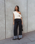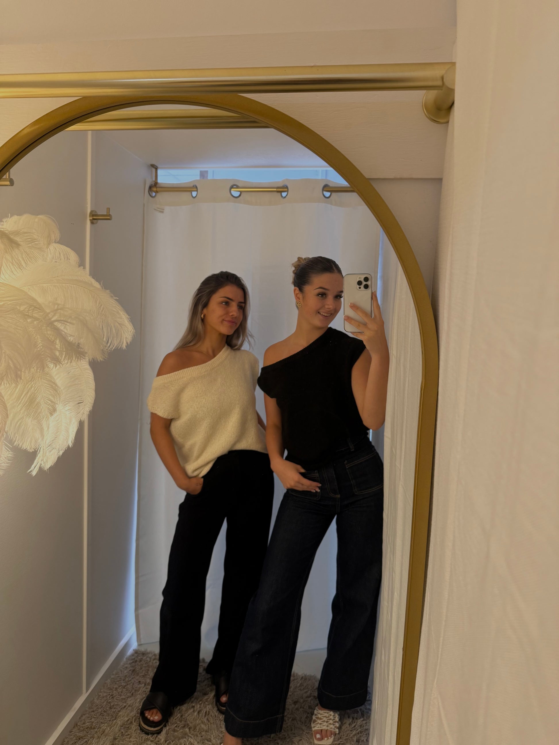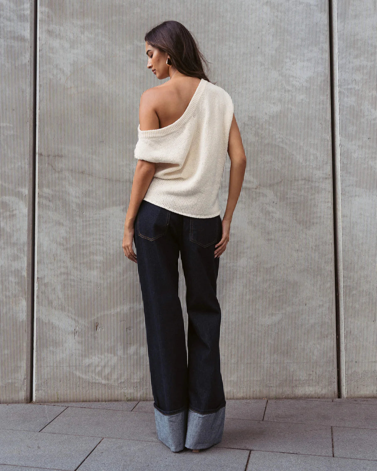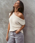 Off the shoulder soft asymmetrical knit top. Regular length, relaxed fit. An essential item that everyone needs in their wardrobes able to dress up with heels or down with sneakers.