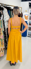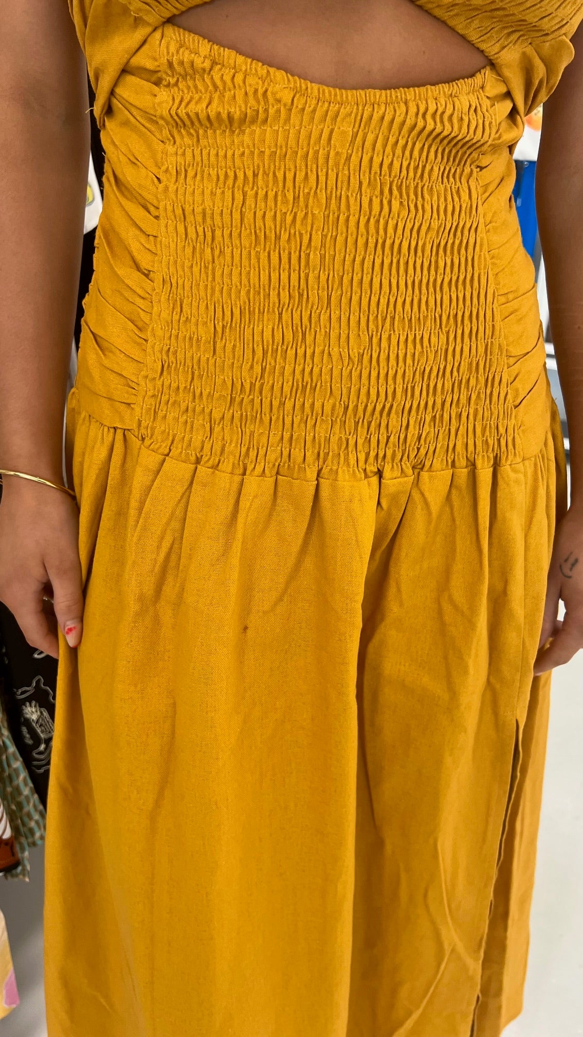 A soft, mustard yellow midi dress that flatters the body in all the right areas. A stretch, ruched front and back, twist front feature and a hidden zipper make this summer midi dress, a must have. True to size.