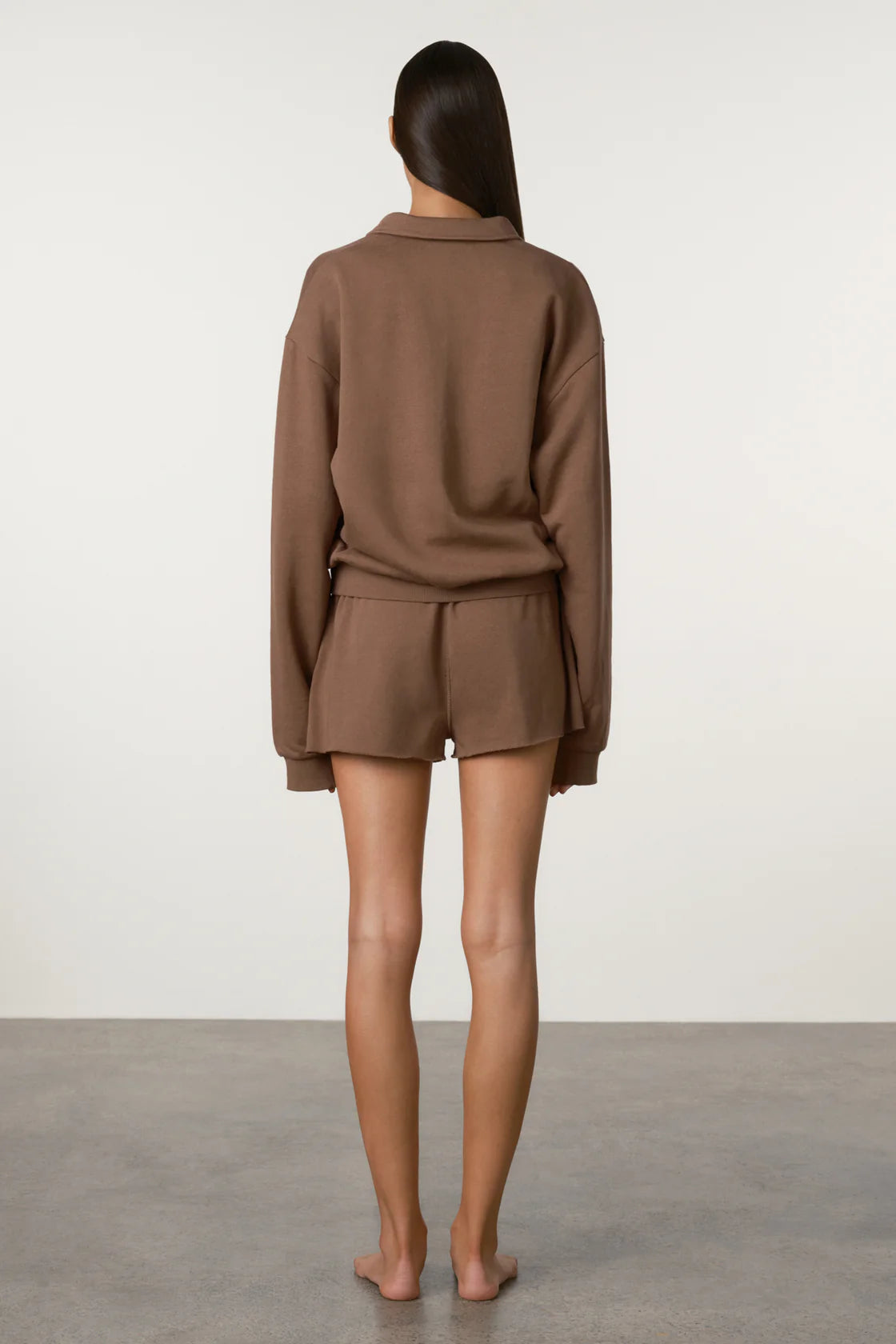 A soft fleece sweatshirt in carob chocolate, designed to be your go-to sports layering piece. It features a collar neckline, ribbed sleeve cuffs, and hem, crafted from a soft, mid-weight brushed fleece. Layer with the ZZ Ocean Blue sweat range or pair with light-wash denim for a casual, nostalgic athleisure look.
